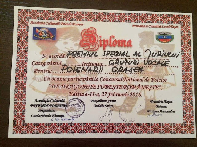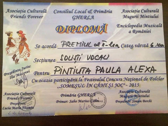 Datorită doamnei Romina, mi-am făcut curaj și, la începutul anului 2016, în data de 6 februarie, am participat la un concurs național, din Ocna Mureș, „Drag mi-e cântecul și jocu‟, alături de grupul vocal „Poenarii”, coordonat de doamna profesoară.Rezultatul acestui concurs (Premiul I) mi-a dat și mai mult curaj, astfel, la sfârșitul lunii, în 27 februarie, am participat la un alt concurs național din Piatra Neamț, „De Dragobete iubește românește‟, unde am obținut Premiul special al juriului.