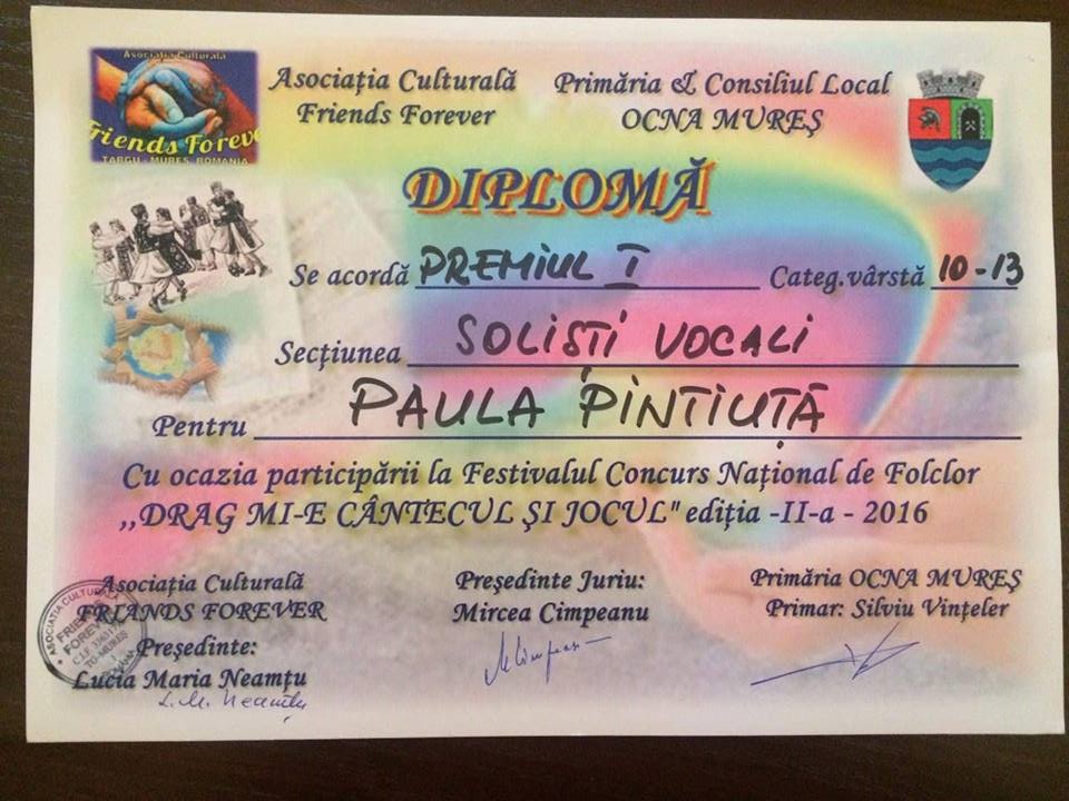 Le-am cântat și i-am încântat pe cei din Abrămuț, Popești, Lugașu de Jos, Aleșd, Salonta, Beiuș, Marghita și Oradea.Împreună cu d-na profesoară, am înregistrat și prima mea melodie ‚’’CE STRĂBUNII OR LĂSAT ’’ apoi a urmat ce-a de-a doua, ’’MAMĂ SUFLET DE PĂRINTE’’ acompaniată de D-l Stângaciu și Horia Boncuț. Cu aceste melodii am participat și la primul concurs ’’ SOMEȘ ÎN CÂNT ȘI JOC’’ acesta desfășurându-se la Gherla. Mare mi-a fost mirarea când la premiere mi-am auzit numele ‚’’ PAULA PINTIUȚA, locul al II- lea’’.Începutul a fost mai greu, am știut că pot mai mult și am vrut să-i răsplătesc pe cei care au crezut în talentul meu, astfel încât la concursurile de la Salonta ’’AM UN VIS’’ și la Ogna Mureș ’’ DRAG MI-E CÂNTECUL ȘI JOCUL’’ am obținut premiul I.