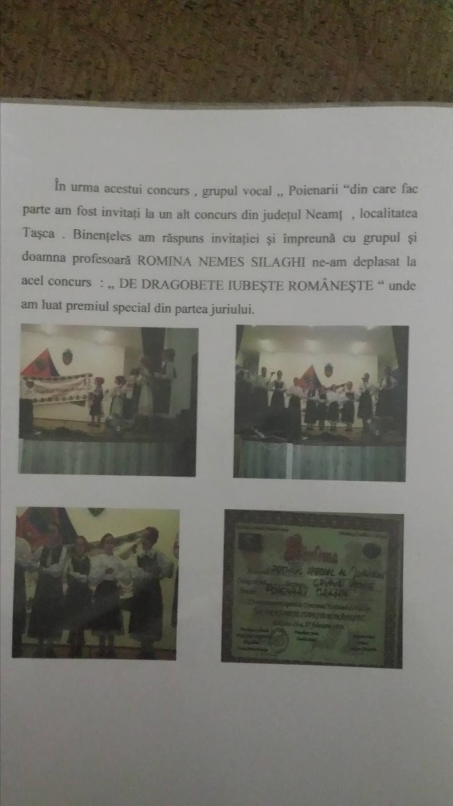 Datorită doamnei Romina, mi-am făcut curaj și, la începutul anului 2016, în data de 6 februarie, am participat la un concurs național, din Ocna Mureș, „Drag mi-e cântecul și jocu‟, alături de grupul vocal „Poenarii”, coordonat de doamna profesoară.Rezultatul acestui concurs (Premiul I) mi-a dat și mai mult curaj, astfel, la sfârșitul lunii, în 27 februarie, am participat la un alt concurs național din Piatra Neamț, „De Dragobete iubește românește‟, unde am obținut Premiul special al juriului.